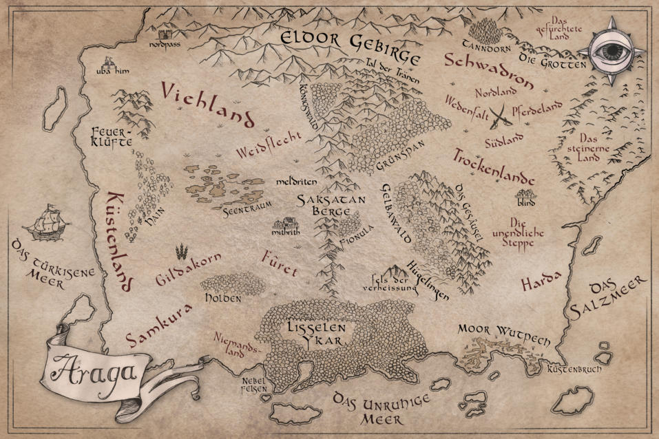 Nachdem die ersten beiden Bücher von AragaIm Lande Araga - Das Geheimnis der ElfenIm Lande Araga - Der Bund der Völkerausschließlich im südlichen Osten von Araga zwischen dem steinernen Land und Lisselen Ykar bis zum Moor Wutpech gespielt haben, wird sich die Geschichte nun mehr und mehr in Richtung Westen verlagern.Die Saskatan-Berge trennen Osten und Westen und werden am Ende von Band 3 Im Lande Araga - Die Bürde des Schicksalsüberquert. Im Anschluss wird es hin zum Zentrum der Macht gehen. Was es damit auf sich hat, werdet ihr in Band 4Im Lande Araga - Das Zentrum der Machterfahren. Deutlich mehr Informationen zu allen Ländereien und deren Geschichte, zu den dort lebenden Völkern, den Besonderheiten und Stellenwert für die einzelnen Bücher findet ihr auf der Araga-Webseite